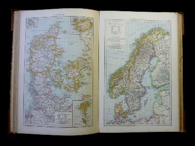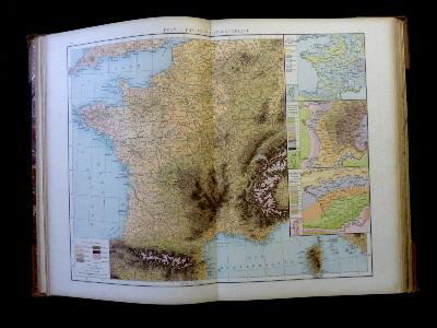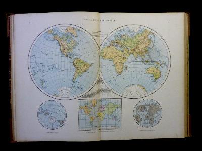 Système planétaire – la lune * terre en deux hémisphères * volcans et coraux * pôle antarctique – archipels de Polynésie * pôle arctique * océan Atlantique * grand océan * Europe politique * Europe physique hypsométrique – massif du Mont-Blanc * côtes méditerranéennes de la France – bassin de Paris * France physique hypsométrique * France (partie nord-ouest) * France (partie nord-est) * France politique * France (partie sud-ouest) * France (partie sud-est) * Grande-Bretagne et Irlande * Pays-Bas * Belgique et Luxembourg * Allemagne politique * Danemark * Suède et Norvège * Suisse * Italie du nord * Italie du sud * Espagne et Portugal * Méditerranée occidentale * Méditerranée orientale * presqu’île des Balkans * Grèce * Hongrie * monarchie austro-hongroise * Alpes franco-italiennes * Caucasie * Russie d’Europe * Pologne * Asie Mineure et Perse * Asie physique et politique * Chine et Japon * Indo-Chine et Malaisie * Asie centrale et Inde * Palestine * région du Nil * Afrique physique et politique * Algérie Sénégambie – côte de Guinée – Afrique du sud * Amérique du nord * Amérique du sud (feuille septentrionale) * Amérique du sud (feuille méridionale) * États-Unis d’Amérique * États-Unis d’Amérique (partie occidentale) * États-Unis (partie orientale) * Australie et Nouvelle-Zélande * Amérique centrale et Antilles – isthme de Panama