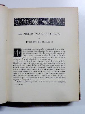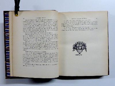 Culs-de-lampe et bandeaux en noir - Demi-reliure ; dos à 2 pièces de titre ; pages de garde marbrées couleurs ; tranchefile ; tranche supérieure couleur (rouge) ; format 18x23,5 ; 462 pages