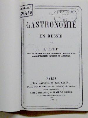 Avalanche de recettes dans ce succulent et désuet traité de la cuisine au temps des tsars. Chef de cuisine du comte Panine, Alphonse Petit fit paraître en 1860 La Gastronomie en Russie, dont la seconde édition, révisée et augmentée, paraît en 1889.