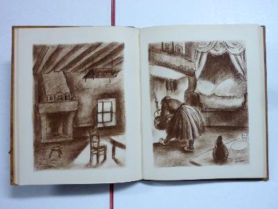 Demi-reliure, dos lisse avec titre et auteur en caractères or, plats cartonnés marbrés couleurs, pages de garde marbrées couleurs, tranchefile, tranche supérieure dorée, dessins monochrome in et hors-texte