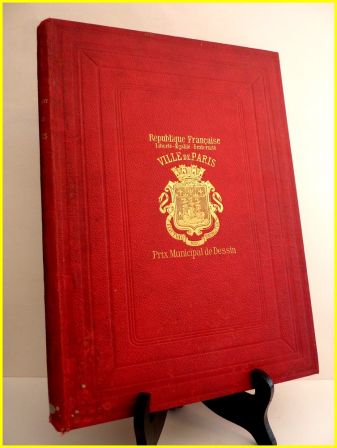 RELIURE : percaline de couleur rouge, aux armes de Paris sur le 1er plat (livre de prix municipal de dessin), pages de garde de couleur bleue
