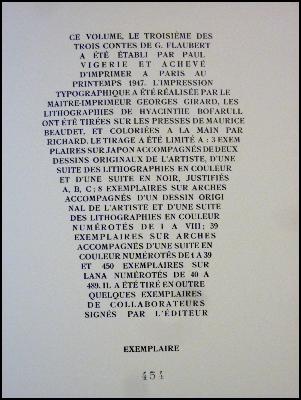 Particularités : 3ème volume des « Trois contes »de Gustave Flaubert – Un des 450 exemplaires sur Lana numérotés de 40 à 489 (exemplaire n° 454)